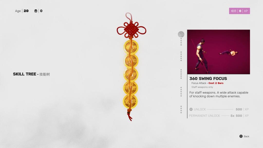 Death is a major part of Sifu, and that’s not just because you’ll be experiencing it a lot. Rather than actually dying, your character ages instead! Starting at the age of 20, you have until your 80s to finish the game. Each time you die though, you are given the chance to spend some experience on some new moves to help make sure you don’t die again. This isn’t the only way to spend your experience though. Each level will have a few shrines to visit. These shrines will refill your health and allow you to select one bonus along with spending your XP on new skills. The shrine bonuses range from increasing your Structure meter to increased weapon durability to increasing your Focus meter to allow you to use it more! Sadly though, these bonus will be lost when you start over again at a young age. This goes for your skills as well but not always. If you pump enough XP into a particular skill before you restart, you’ll be able to keep it permanently! As this does tend to take a lot of XP it’ll be awhile before you have them all, but this does give you a way to slowly build up your arsenal of skills.