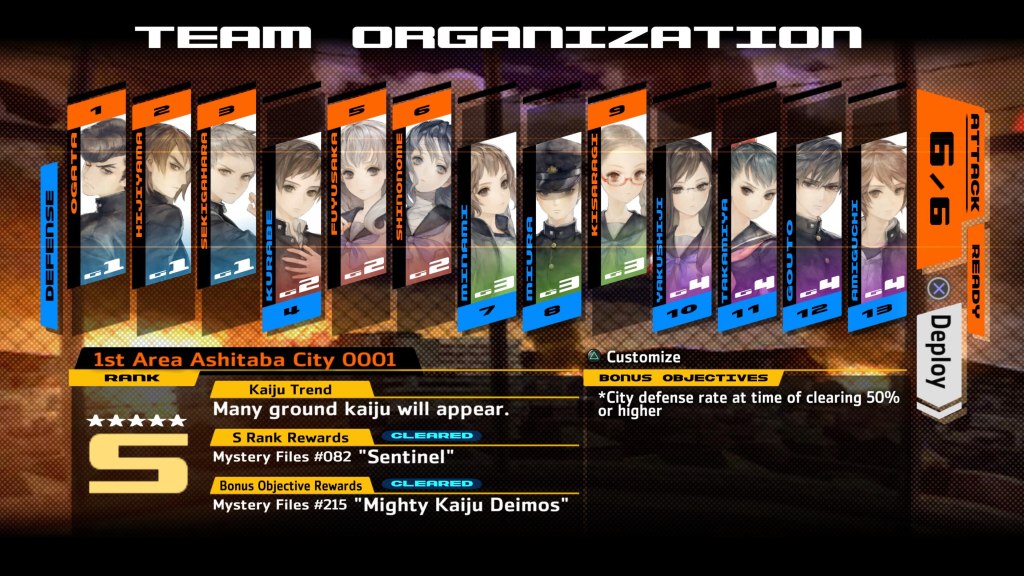 You start by selecting six Sentinels with the other seven taking up defense rolls for the fight. There are four different types of Sentinels that all do better in certain situations compared to others. Like the Generation 1, or G1, Sentinels are great at close range battles but are terrible at long range and they can’t attack flying enemies. The Generation of the Sentinel is really what determines the biggest difference between each. However, the pilots also have their own unique skills. They mostly extend to team composition and positioning on the map. For example some characters will get a boost when placed near a character they have a personal connection with or just being on the same time, while others have skills that give them a boost when no one else is positioned close to them at all. They vary a lot more than just positioning but those are just some examples. These skills are something else you need to consider when deciding on your team. And what team you pick for each mission can really be the difference between winning or losing depending on the type of kaiju that appear. Luckily, the game lets you know ahead of time which kaiju are most likely to appear so you can keep this in mind when forming your team. You can also upgrade the Sentinels and unlock new abilities for them with Metachips, which you can earn through playing levels in Destruction as well as from finishing a section of someone’s story in Remembrance. After that, you deploy into the mission and it’s up to you to defeat the kaiju and defend the city!
