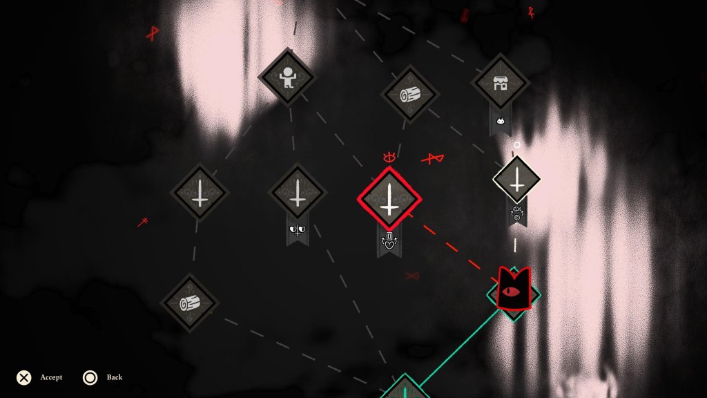 Apart from running the cult and getting more followers, it’s your job to go out crusading in order to kill the heretics of the Old Faith! This is where the roguelite elements come in as you have to go into dungeons and fight your way through the enemies to work your way up to the leaders of the Old Faith. There are four dungeons that have their own looks, bosses, and enemies, though a few enemies are shared between all four. Beyond that, they all are very similar. The layouts are always randomized and your main goal is to reach the door at the end and progress to the next area. The rooms in each of the areas either include enemies, an NPC that will give you a new Tarot Card, which basically gives you a random new buff for the run, or a new weapon/curse. There are a few rooms that will sometimes just give you loot but those are pretty rare. Once you get to the first door leading to the next area in a dungeon you are given a choice about how to work your way to the end. This is also randomized as well! You are given a choice between fighting through another area with more enemies, going to a shop keeper, rescuing an animal and bringing them to your cult and things like that. You are able to see what each path offers leading up to the boss so you’re given plenty of freedom when it comes to planning your path, which is really nice!