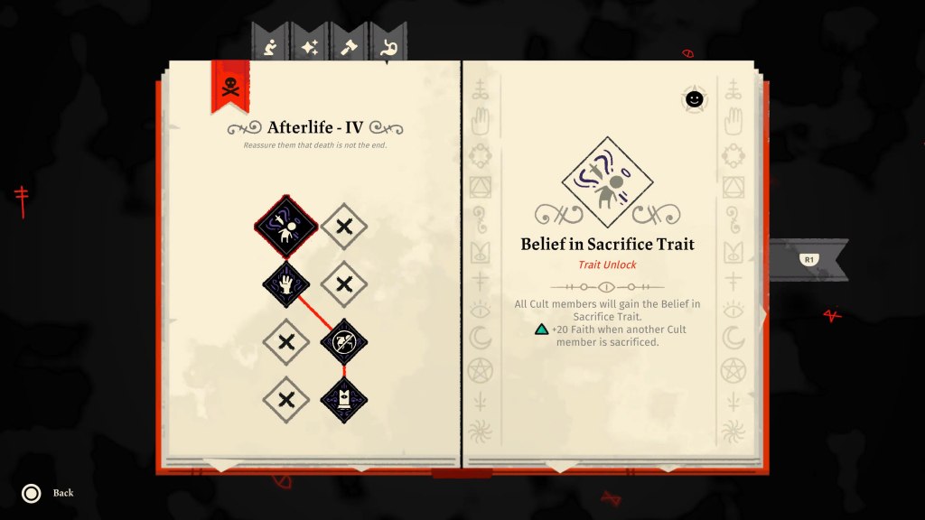 Beyond just building though, you are also given the choice of what kind of doctrines you’d like to impose upon the cult. This is what dictates how your cult is run basically and what rules your followers will follow. After collecting enough Commandment Stone Fragments you are able to go into the temple you built for the cult and decide upon a new doctrine! From here there are five categories to choose from with four different doctrines for each. The categories are Afterlife, Work & Worship, Possessions, Law & Order, and Sustenance. Which category you want to address first and in what order is completely up to you. After picking one of the five though, you are given a choice between two different doctrines. For example, the first doctrine you make in the Afterlife category will give you a choice between the Belief in Sacrifice Trait or the Belief in Afterlife Trait. Belief in Sacrifice makes it so your followers will gain Faith instead of losing it when you sacrifice a follower while the Belief in Afterlife will make it so they don’t lose as much Faith when a follower dies for any reason. Once you make the choice between the two, you can’t go back! You will be given this kind of choice four times for each of the five categories.