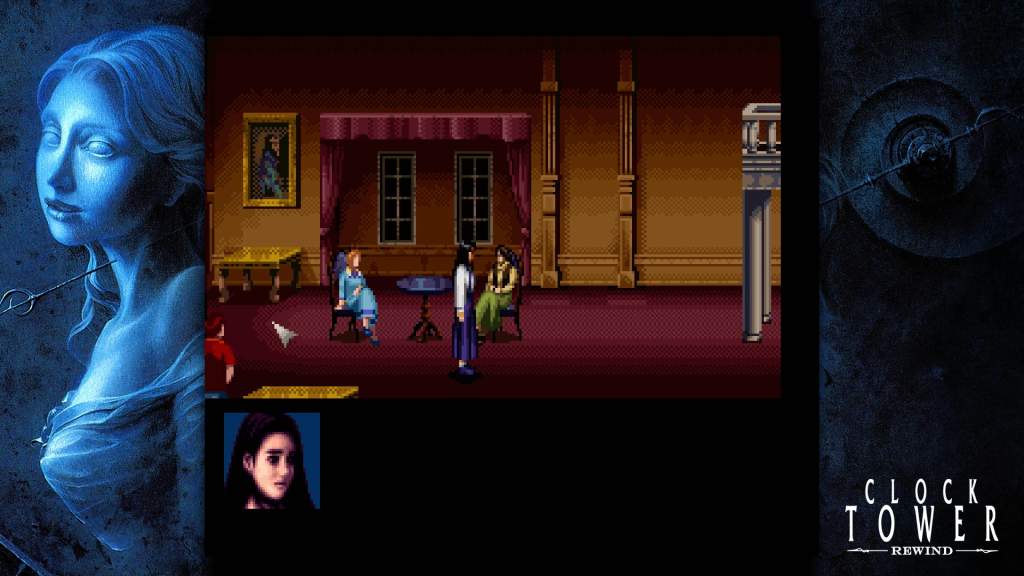 Clock Tower is basically a point and click adventure horror game! You play as Jennifer, an orphan recently adopted by Mister Barrows along with your three friends Laura, Anne, and Lotte. All four of you are brought to his mansion way far out in the woods by Miss Mary. This is about all the context you’re given to start things off! You have a short intro of all the girls following Ms. Mary to the mansion and brought into one of the main rooms of the house before Ms. Mary goes off to find Mr. Barrows. And just like that you are playing the game! Like I said before this game is a point and click game. To control Jennifer and tell her where to go, you have to click different parts of the screen rather than just moving the analog stick or something. This is how it is for most of the Clock Tower series too. And while I was originally worried about this feeling super clunky and not being able to click certain things in time, especially since you’ll be controlling the cursor with a controller over a mouse like you would with most point and click games, the game actually controls super well! It was clearly designed with the controller in mind so it never feels too jarring to play the game this way.