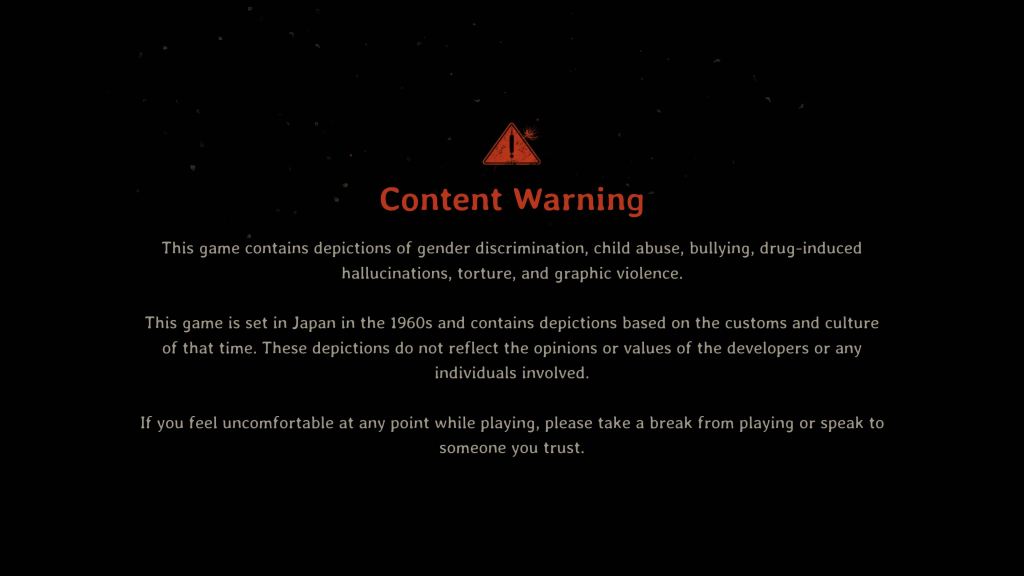While not the most important thing to all kinds of horror, story, premise, and characters are extremely important to psychological horror which is what the Silent Hill series is known for! This is actually why I feel most of the games after the PS2 era of the series failed. They just weren’t able to come up with compelling story and characters. One of the best parts about playing a Silent Hill game comes from looking into the meaning of things, just about everything has some kind of hidden mean below the surface in Silent Hill, even for the original game! Like I said before though, it’s clear f got most of its inspiration from Silent Hill 2 and I don’t just mean that from a psychological horror stand point. Silent Hill f delves into some heavy and uncomfortable themes, so much so the game actually has a content warning after you start it up.
